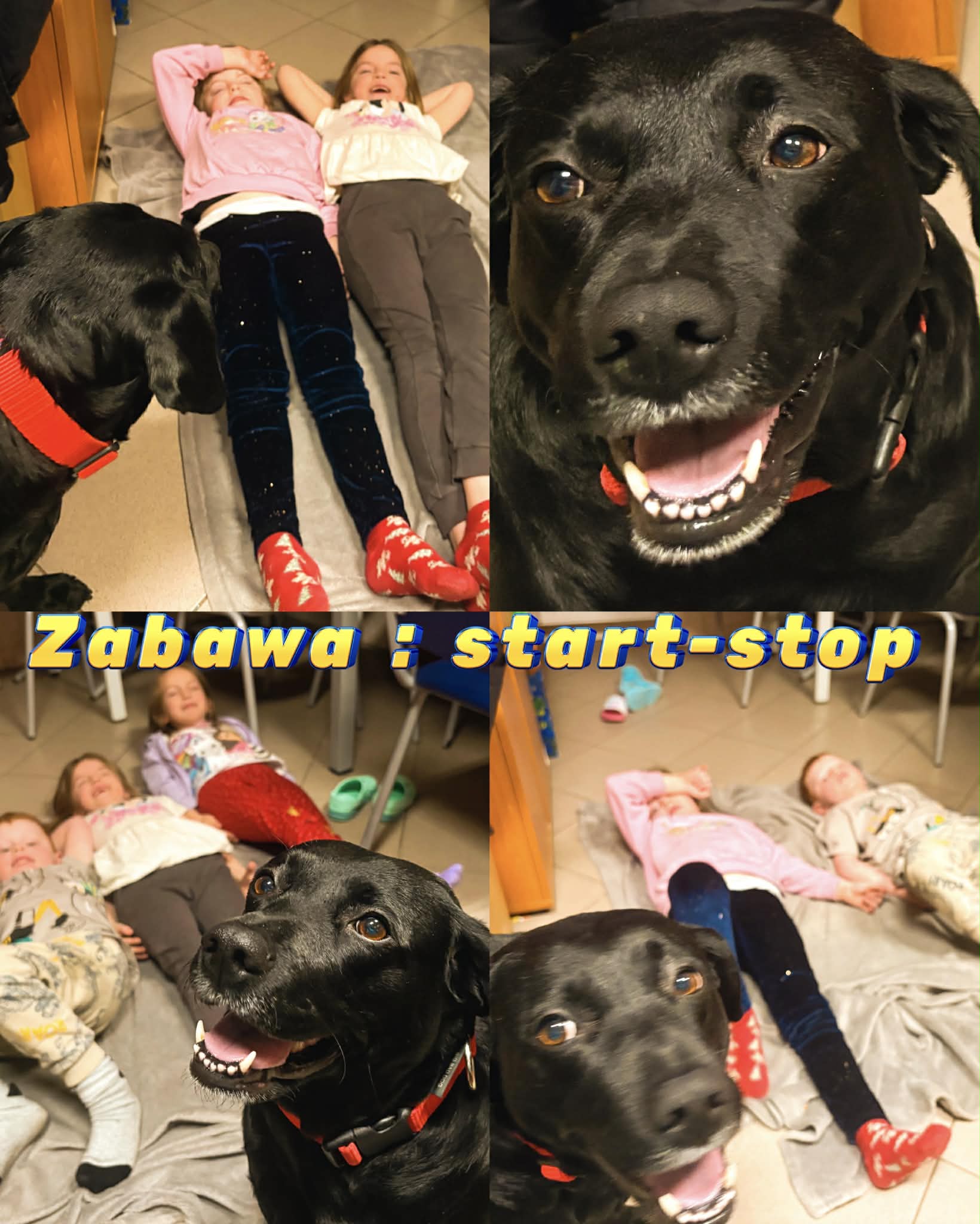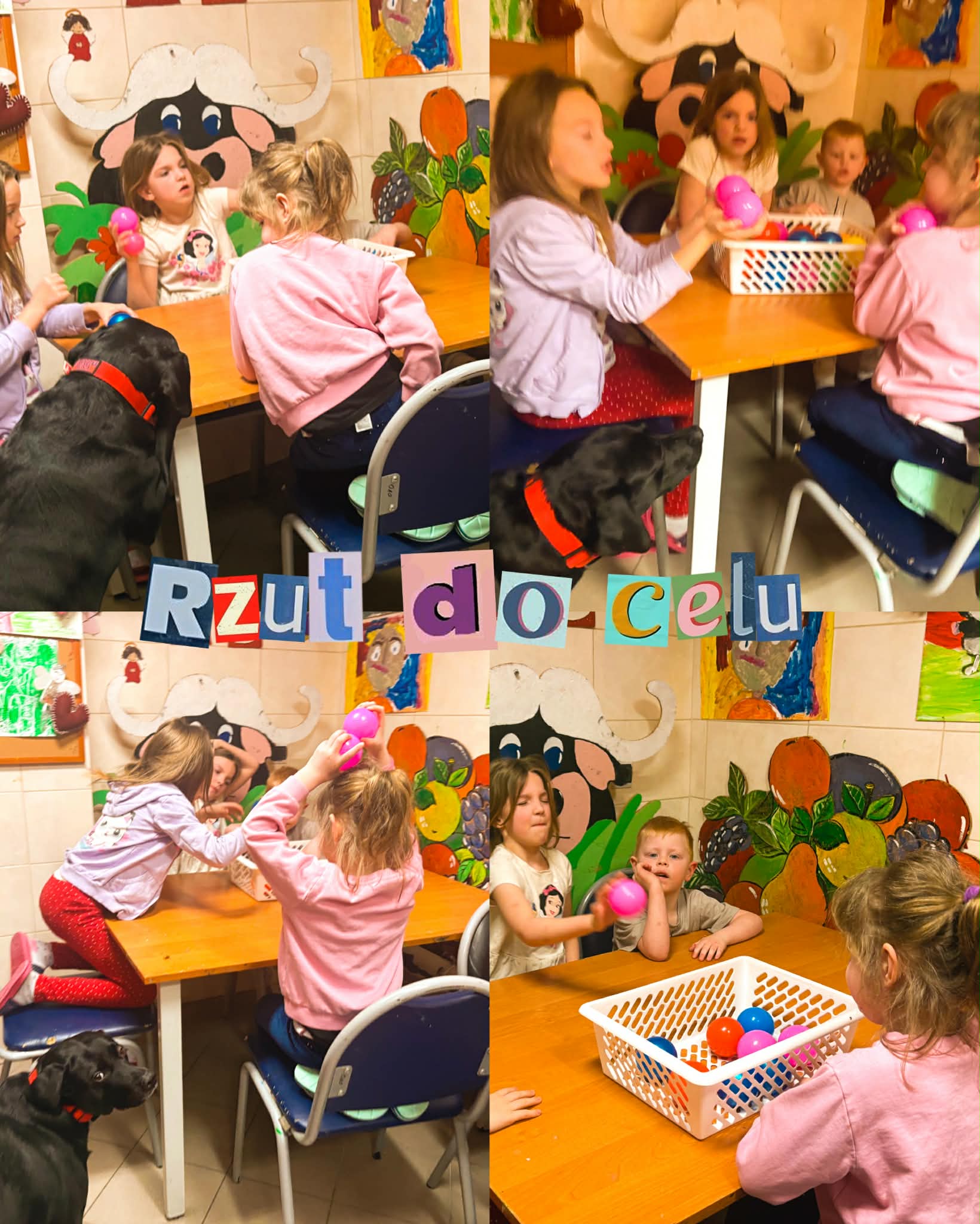 W miesiącu lutym wychowankowie uczestniczyli w zajęciach z dogoterapii, które łączyły elementy zabawy, aktywności ruchowej oraz rozwijania umiejętności społecznych. Podczas spotkań dzieci wykonywały m.in. kolorowe makaronowe obroże dla psa oraz brały udział w ćwiczeniach motoryki dużej, takich jak turlanie, rzut do celu, ćwiczenia równowagi, zabawy z matą węchową czy zabawa „start–stop”.