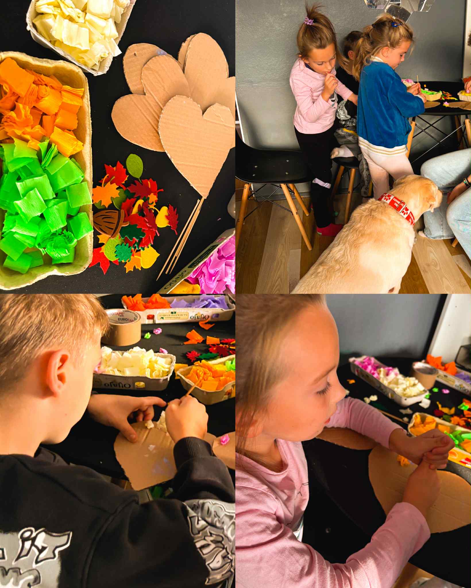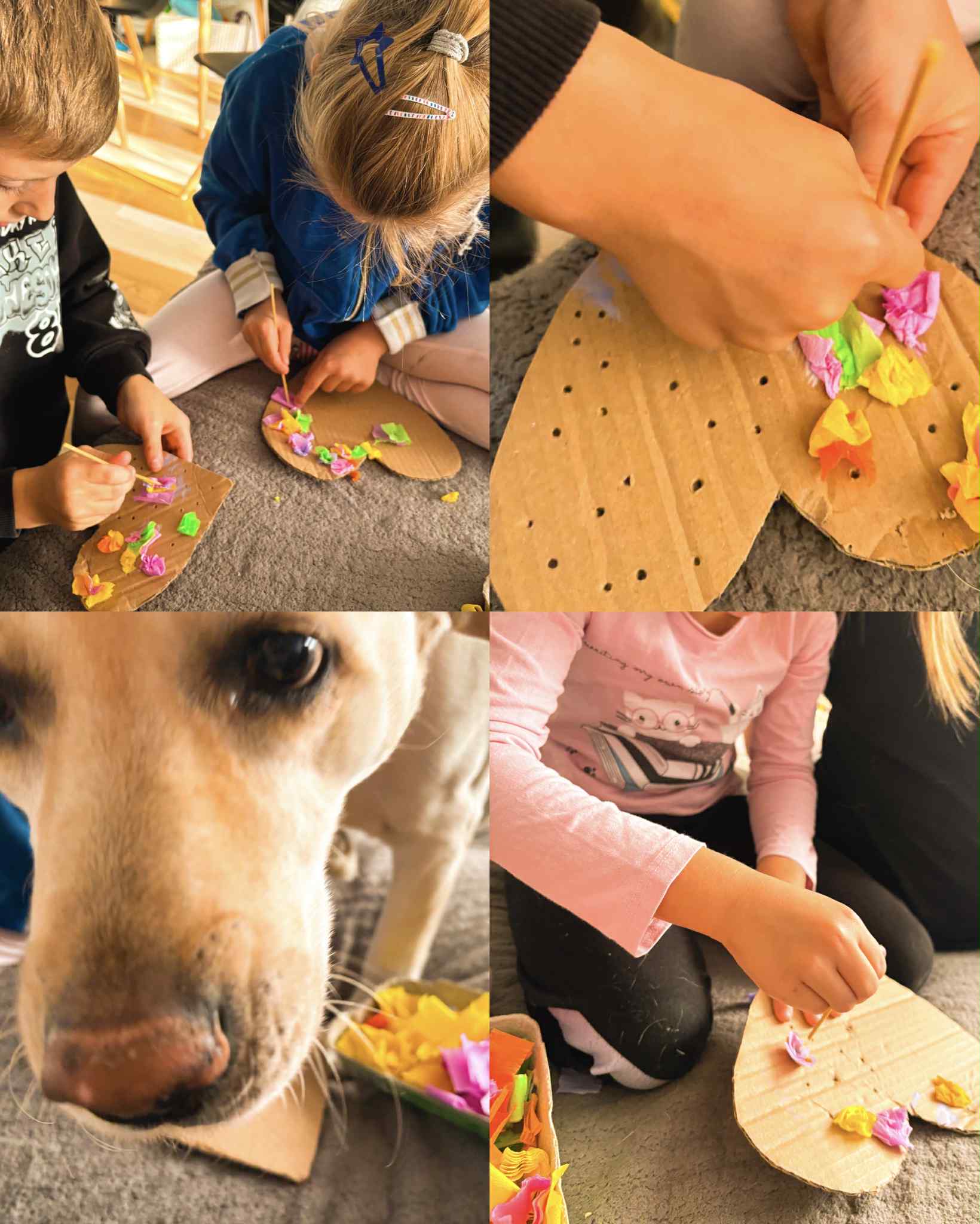 Dzisiejsze zajęcia z zakresu dogoterapii pt. „Serce psa” stanowiły formę terapii, w której dzieci poprzez działania manualne kształtowały umiejętności emocjonalno – społeczne. Proces wtykania kolorowej bibuły w tekturowe serce wymagał precyzji ruchowej, koncentracji oraz stopniowego wykonywania zadania, co wspierało rozwój cierpliwości. Obecność psa wprowadzała element naturalnej regulacji emocji – dzieci uczyły się, że podobnie jak w kontakcie ze zwierzęciem, efekt pracy można osiągnąć jedynie w spokojnym, systematycznym tempie. W ten sposób pies pełnił rolę mediatora terapeutycznego, wzmacniając pozytywne wzorce zachowania i budując u dzieci zdolność do samokontroli.