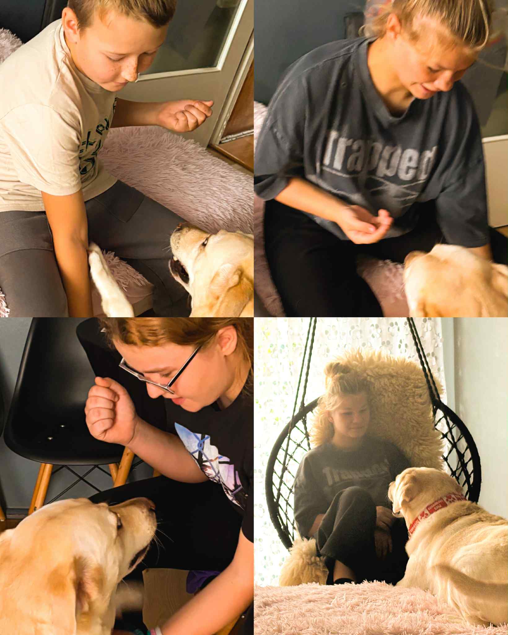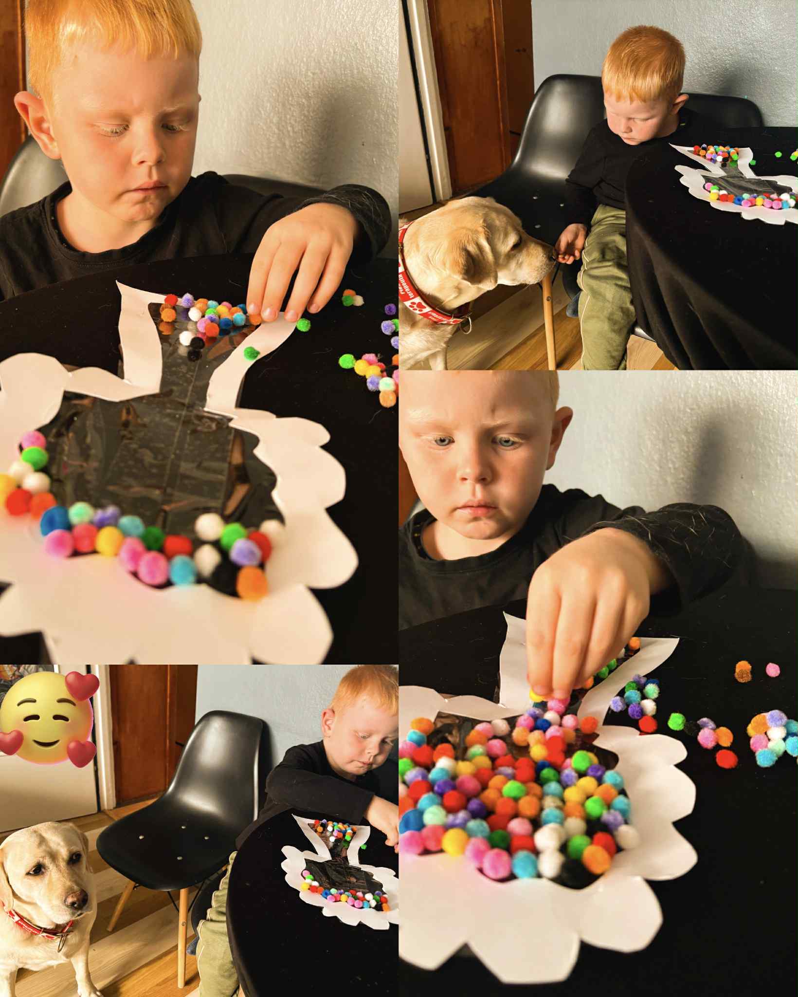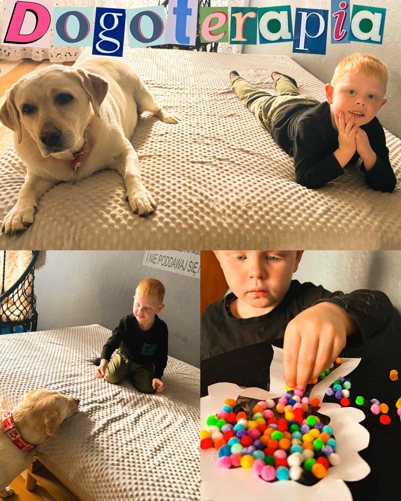 Podczas zajęć dogoterapii z udziałem psa terapeutycznego Maja, chłopiec uczestniczył w ćwiczeniach ukierunkowanych na stymulację integracji sensorycznej, rozwijanie motoryki małej, koordynacji wzrokowo – słuchowej oraz doskonalenie funkcji poznawczych poprzez segregowanie i dopasowywanie elementów. Dzięki aktywnościom manualnym angażującym różne faktury materiałów następowała również stymulacja układu dotykowego i doskonalenie różnicowania sensorycznego. Zajęcia sprzyjały ponadto treningowi koncentracji uwagi, planowania sekwencji działań oraz rozwijaniu kompetencji społeczno – emocjonalnych poprzez współdziałanie z terapeutą i psem.