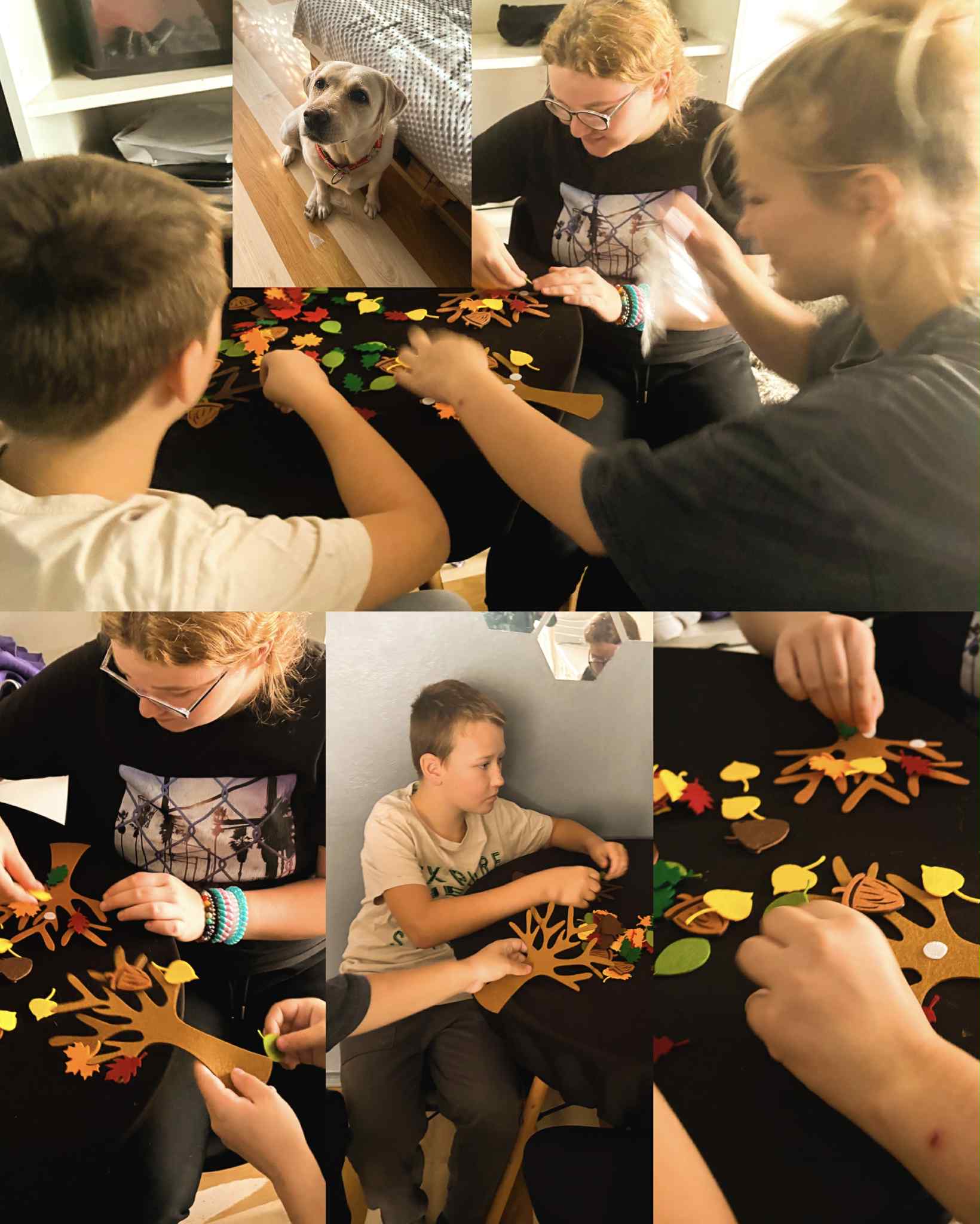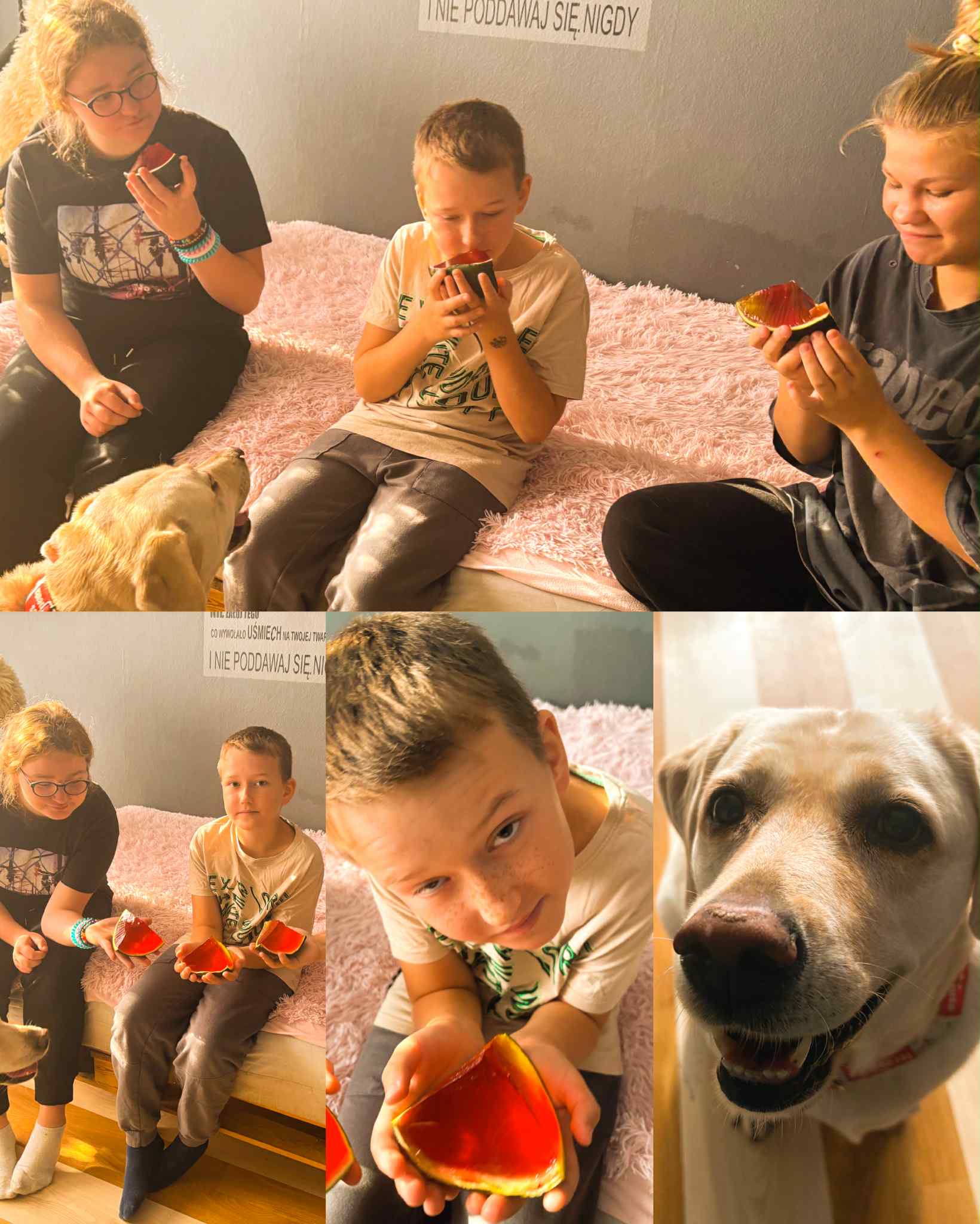 Podczas zajęć dogoterapeutycznych przeprowadzono polisensoryczną stymulację analizatora wzrokowego poprzez czynność naklejania elementów przyrodniczych ( liści, żołędzi ) na strukturze filcowego drzewa, co wspierało koordynację wzrokowo – ruchową oraz procesy percepcyjne. Równolegle dokonano stymulacji analizatora smakowego poprzez degustację zdrowego produktu spożywczego ( galaretki w łupinie arbuza), sprzyjając różnicowaniu bodźców smakowych i rozwojowi świadomości żywieniowej. Obecność psa terapeutycznego pełniła funkcję czynnika modulującego napięcie emocjonalne, wzmacniając motywację i zaangażowanie dzieci w aktywność terapeutyczną. Całość oddziaływań sprzyjała integracji sensorycznej i kształtowaniu adaptacyjnych wzorców zachowania.